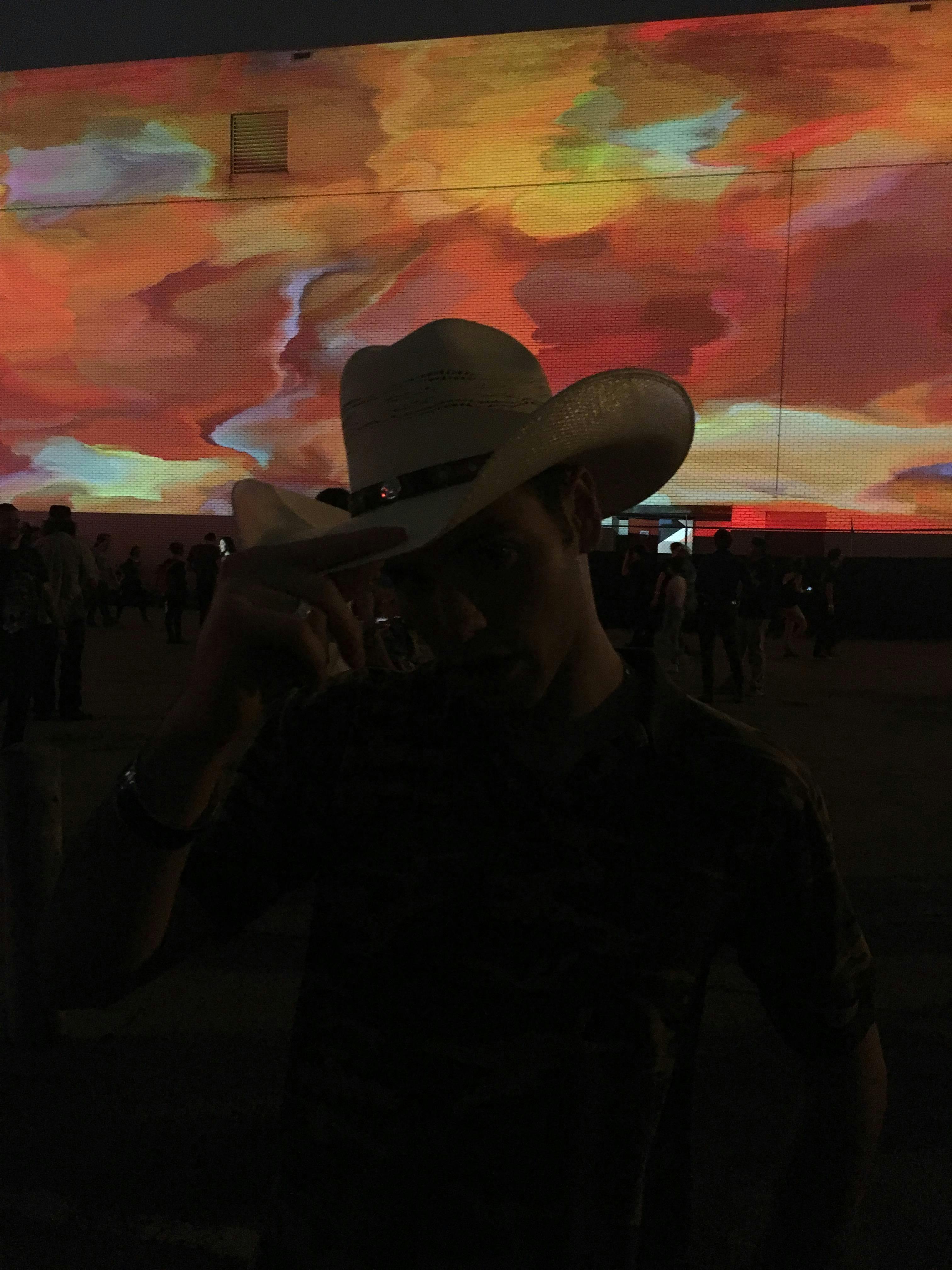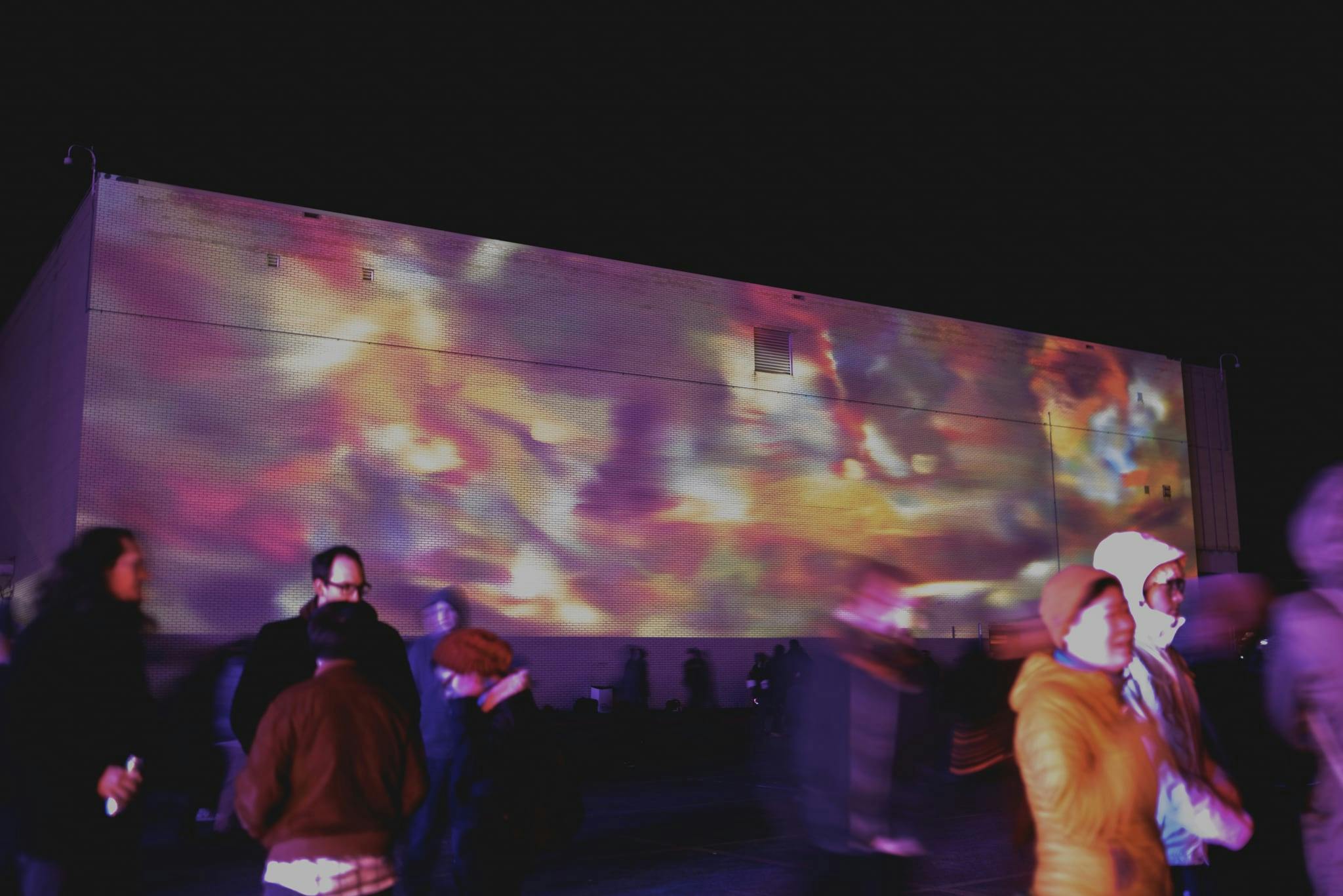 The work incorporated a real-time video feed from the performances on the main stage located opposite the wall containing the projection.